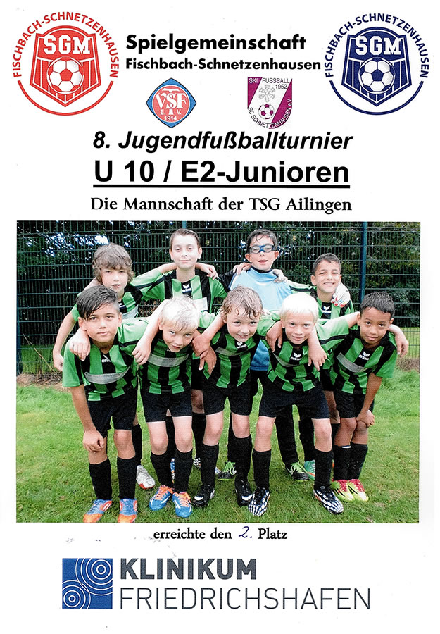 Beim Heimspiel am vergangenen Samstag liefen die E-Jugend-Spieler im neuen Trikot-Outfit auf. Unterstützt hat uns hierbei Fliesenlegermeister Oskar Pfister, der den neuen Trikotsatz in traditionellem TSG-Grün gesponsert hat. Die Jungs ließen es sich nicht nehmen und weihten die Trikots auch gleich mit einem verdienten 2:1 Sieg gegen den SV Kressbronn ein. Besten Dank an Claudia und Oskar Pfister für diese tolle Unterstützung unserer Jugendfußballer.