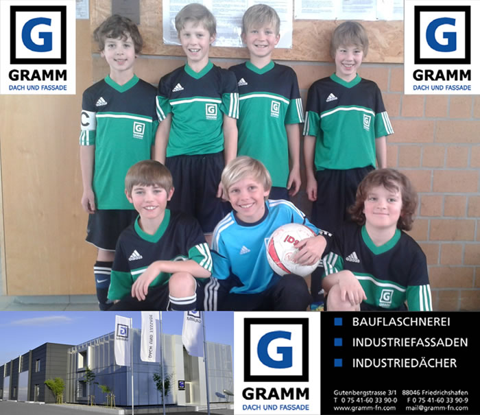 Unsere E- Junioren haben einen neuen Trikotsatz bekommen. Stolz präsentieren die Jungs ihr neues Outfit, welches von der Firma "Gramm – Dach und Fassade" aus Friedrichshafen gespendet wurden. Ein recht herzliches Dankeschön geht somit an Fam. Gramm, so macht das Fussball spielen wieder richtig Spaß!