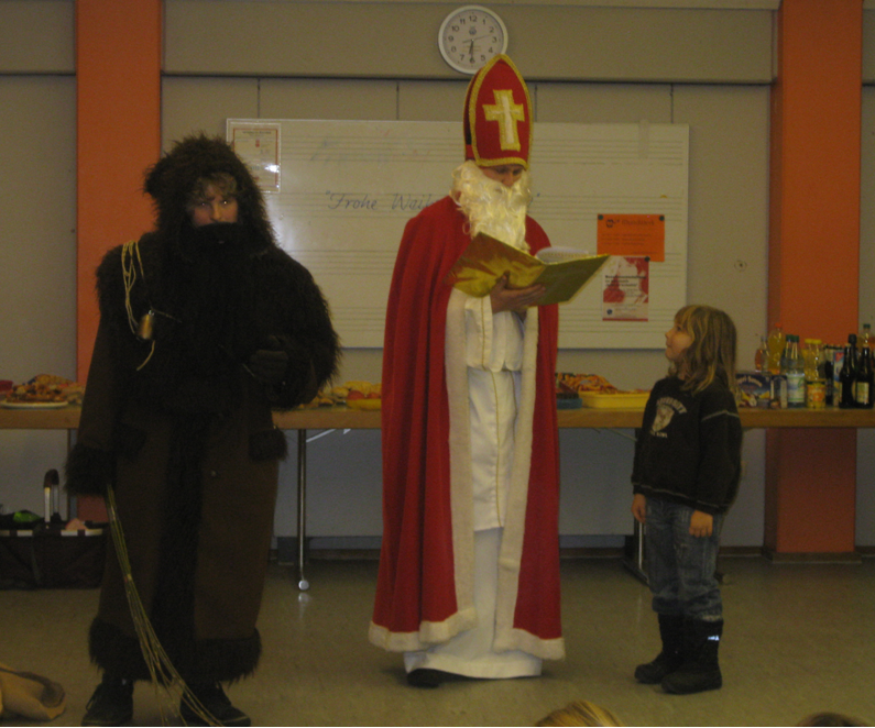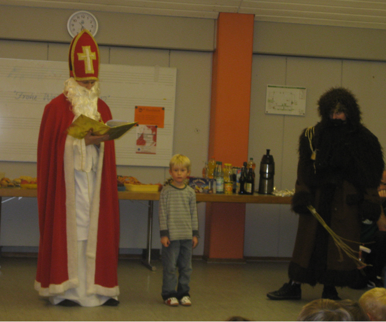 Zum letzten Training 2011 hatten sich ganz besondere Gäste zum Training angemeldet - Sankt Nikolaus und Knecht Ruprecht. Zuerst war aber nochmals der Trainingsfleiss der Bambinis gefragt und somit machten wir uns in der Rotachhalle auf Tore Jagd. Die Anspannung war aber hier schon zu spüren - hatte da der Ein oder Andere etwa ein schlechtes Gewissen? Um kurz nach sechs war es dann endlich soweit, Nikolaus und Ruprecht betraten den Nebenraum der Halle und wie durch ein Wunder war es auf einmal ganz still. er Nikolaus las aus seinem goldenen Buch über jeden Spieler einen Reim vor und als Belohnung gabs vom Ruprecht noch was zu naschen. Im Anschluss wurde dann das Buffet eröffnet, und bei Lebkuchen, Butterbretzeln, Käsespieße und ein paar Getränken ließen wir den gelungenen Abend gemütlich ausklingen. Einen guten Rutsch und viel Tainingsfleiss für 2012 wünschen Eure Trainer Sarah, Mike und Michel